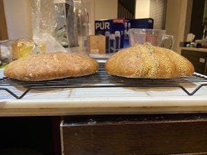 With the long distance assistance of my bread-making friend turned temporary sensei (which included about 20g of his precious “goo” (sourdough starter), sent by mail) I’ve embarked on a bread making phase. This is after a hiatus of I’d guess about 40 years, the last time I tried baking my own, long before the days of the surge in sourdough seriousness (they’ve been serious about it in other…