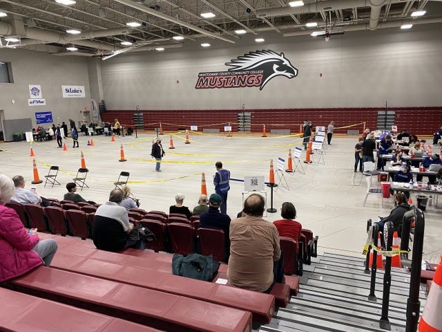The gymnasium at Montgomery County Community College set up as a vaccination center, winter 2021.